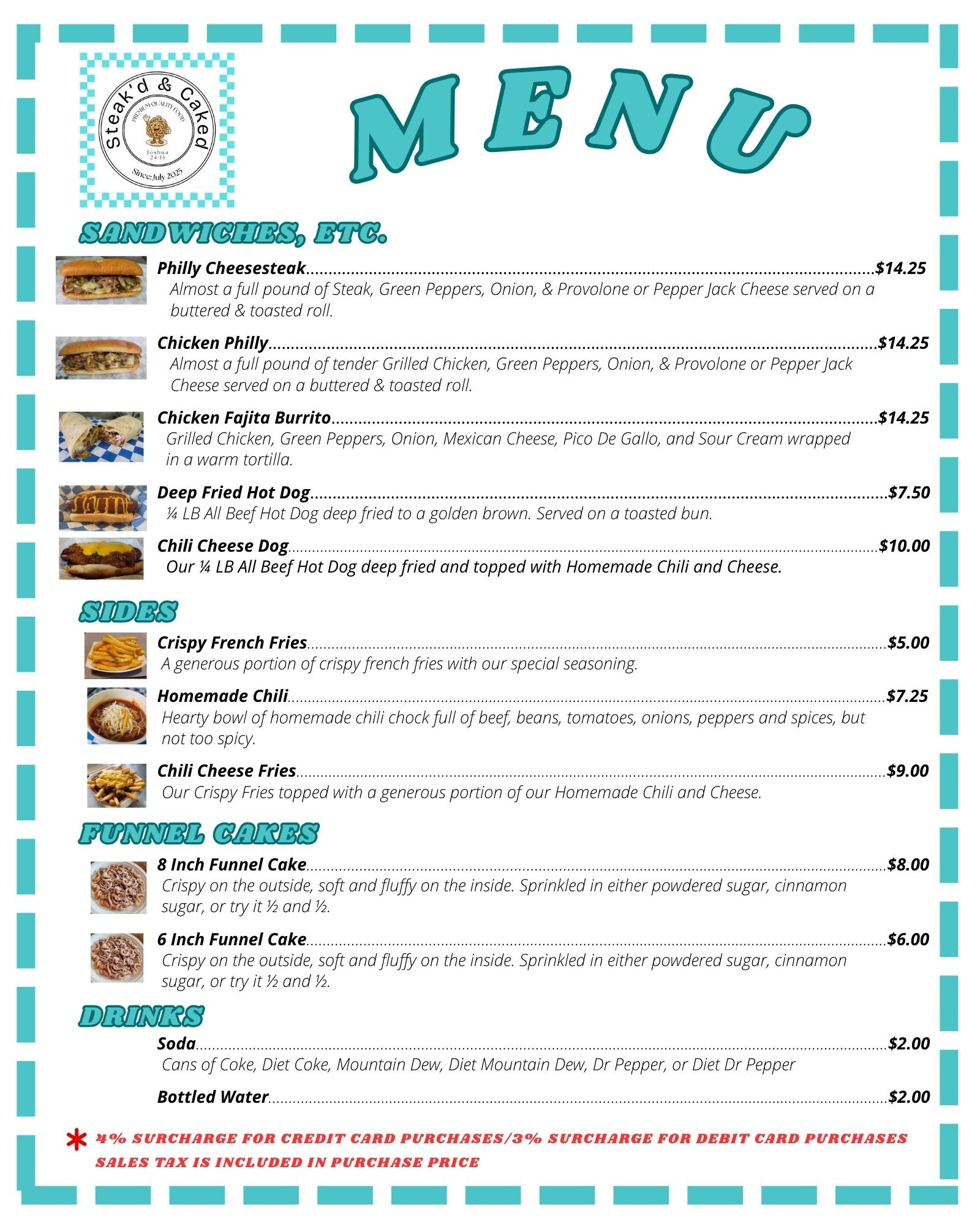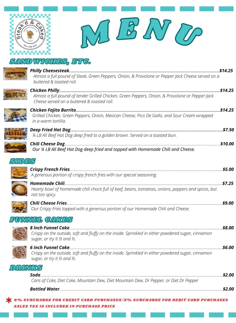 Our menu offers something to suit just about any craving. If you are really hungry, try our hot and savory Philly cheesesteak sandwich. If you would prefer something on the lighter side, our delicious ¼ lb. deep fried hot dogs are a great alternative: Hot and juicy on the inside, slightly crispy on the outside, they are next level tasty. For a sweet treat, indulge in our signature funnel cakes, available in 6 or 8 inches. Our menu offers something to suit just about any craving.